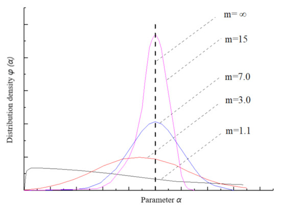 where: α is the grouting-reinforced body primitive mechanical properties parameter (single shaft compressive strength, elastic modulus, permeation coefficient, etc.); α0 is the average value of the corresponding primitive unit mechanical properties; m is uniformity the coefficients, the uniformity of the reaction grout reinforcement; φ (α) is a statistical distribution density of the grouting-reinforced body primitive mechanical properties α.