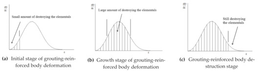 Analysis of the above figure shows that at the initial stage of grouting-reinforced body deformation, a small number of low-strength primitives are destroyed, and the overall damage of grouting-reinforced body is small; as the deformation continues to increase, the number of destroyed primitives increases sharply, the reason is that, from the probability of the strength distribution of the primitive body, the strength of the primitive body is concentrated around a certain value, and the number is the largest. When the deformation reaches the number value, the primitive body that constitutes the grouting-reinforced body is largely destroyed, resulting in the rapid decrease of the overall strength of grouting-reinforced body; in the later stage of deformation, until the overall failure of grouting-reinforced body, there are still a small amount of primitives that remain intact, and the strength of these primitives is greater.
