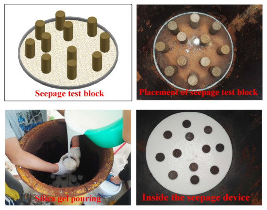 The main part of the seepage device is a detachable iron bucket. A small hole with a diameter of 10 mm is set under the iron barrel, and a water collection device is placed under each small hole to help collect the amount of seepage water passing through the test sample and test the permeability coefficient of the sample. Silica gel is used to fill between the samples, the specific details is shown in Figure 5.