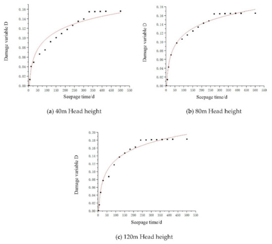 It can be seen from the figure that the damage variable caused by the deterioration of the grouting-reinforced body caused by the seepage effect increases with time. The greater the seepage water pressure, the larger the damage variable, but the stable value of the damage variable is within the satisfying range of Equation (8). Within this, the correctness of Formula (8) is verified. In the seepage degradation test with a water pressure of 40 m, the damage variable of grouting-reinforced body when the damage is stable is about 0.15~0.16. In the seepage degradation test with a water pressure of 80 m, the damage variable of grouting-reinforced body when the damage is stable is about 0.16~0.17. In the seepage degradation test with a water pressure of 120 m, the damage of the grouting-reinforced body is stable when the damage is stable. The damage variable is about 0.18~0.19. It can be seen that under the action of high head water pressure, the damage variable of grouting-reinforced body is gradually increasing, which is related to the structure of the grouting-reinforced body. The main components of grouting-reinforced body are sand particles, cement hydration, and the cementation of the two. The main effect of seepage damage is that under the action of the grouting-reinforced body under water pressure, the pore water pressure in the reinforcement body has an impact on the original interior of the reinforcement. The expansion of micro-crack pores and other structures, result in an increase in grouting-reinforced body porosity and an increase in permeability coefficient. Therefore, under the premise of a certain grouting-reinforced body structure, the higher the water head height that the reinforcement body can withstand, that is, the greater the water pressure, the greater the pore water pressure in the reinforcement body, and the greater the influence of pore water pressure on the grouting-reinforced body. When the stability is reached, the damage of grouting-reinforced body will be greater.