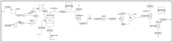 An Aspen flowsheet for the SCE process is illustrated in Figure 3. For the proper design of the SCE stage, it was essential to employ appropriate mathematical representations. The SCE stage involved extraction from various solid natural matrices that were thermodynamically represented through solubility control, external mass transfer control, and/or internal mass transfer conventional models. Notably, three manipulators were used in the modeling of the SCE stage. The first one, “EXTRCALC” was used to estimate the quantity of the analytes to be extracted by the Sc-CO2/water solvent system based on the UDF patched to the software. The UDF contained the necessary data and equations for the solubility behavior of glucose, fructose, and other essential components of date fruit into the solvent mixture. The second one, “CO2OUTCA” calculated the amount of CO2 lost due to the opening of the extraction cell to fix the overall mass balance of the system. The third manipulator, “SEPARATO” was used to estimate the extracted mass lost with the exhaust stream of CO2 gas.