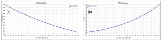 The extraction pressure of the SCE process is an important parameter that impacts the overall extraction efficiency []. Figure 4 shows the pressure effects on the extraction of reducing sugars from the freeze-dried date pulp. Simulation studies revealed that the extraction pressure had varying effects on the recovery of glucose and fructose sugars. For fructose sugar, the recovery efficiency decreased with incremental values in the operating pressure (Figure 4a). On the contrary, the extraction yield increased for glucose sugar with an increase in the operating pressure (Figure 4b). This opposing behavior can be ascribed to the different signs of the empirical coefficients in Equation (2) for glucose and fructose solubility in Sc-CO2. Consequently, the trade-off optimization tool of Aspen software was utilized to estimate the optimum pressure required for the maximum extraction of the total reducing sugars. Results showed a maximum product flow (glucose + fructose) of 73.70 kg/h was achieved at an operating pressure of 308 bar.