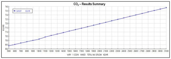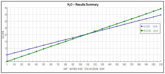 Results on the sensitivity analysis for the solvent:co-solvent ratio showed that a co-solvent concentration of 6.77 wt.% produced the maximum recovery of reducing sugars from the date pulp biomatrix. The simulation run resulted in an overall extraction yield of 99.1% for the reducing sugars with flow rates of 34.14 kg/h and 39.13 kg/h for glucose and fructose, respectively. Moreover, the sensitivity analysis showed that the total extracted quantity of glucose and fructose increased with the flow rate of Sc-CO2, as shown in Figure 5. Almost all of the reducing sugars were extracted into the solvent system for an Sc-CO2 flow rate of 31,000 kg/h. Further increases in the Sc-CO2 flow rate had no significant effects on the sugar extraction. This quantity of Sc-CO2 defines the solvent limit required for the maximum removal of targeted sugar components from the date palm fruit. Based on the optimization studies for the solvent:co-solvent ratio and the Sc-CO2 flow rate, the optimum flow rate of water was estimated as 2100 kg/h for the maximum recovery of glucose and fructose components. Figure 6 shows the effect of the water flow rate on the extraction of reducing sugars from the fruit biomatrix. Similar to Sc-CO2, the extraction yield increased with incremental levels of water flow rate. The improvement in the extraction of monosaccharides was due to the enhanced permeability and polarity of water molecules at the extraction conditions.