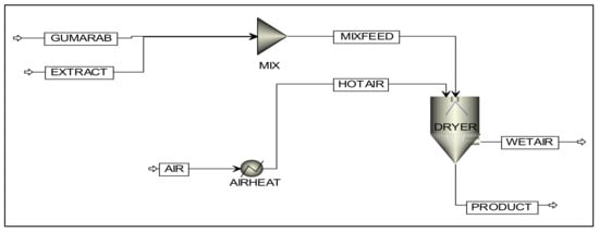 In general, beneficial features such as high drying rate, shorter drying time, and broad working temperature make SD an ideal choice for drying of food products to powder form []. The complicated three-dimensional nature of spray-dryers often makes it difficult to describe their exact behavior using empirical models. In this work, Aspen’s built-in simulator was used to characterize the SD process of the SCE extract (glucose and fructose solution) mixed with GA as the carrying agent. The model employed an Eulerian–Lagrangian approach to compute the particle motion paths, and heat and mass transfer phenomena occurring between the drying medium and the feed particles []. The choice of GA was to overcome the stickiness effect and increase the glass transition temperature of the mixture. Based on the previously reported experimental studies of SD for date fruit powder, the mass ratio of GA to SCE extract was fixed as 0.4 []. Figure 7 represents the process flow diagram for the SD stage of the IDSPP technology.