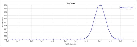 Product solubility is a critical benchmark for food products, especially food-grade sugars, to be used as an additive in food and beverages. In general, several parameters of the product, such as composition, water activity, morphology, equilibrium moisture content, etc., affect the product solubility []. The solubility of the product (glucose and fructose mixture) in an aqueous medium was simulated over a temperature range from 0 to 100 °C and at a pressure of 1 bar based on the UNIQUAC (universal quasichemical) thermodynamic model. The solid–liquid phase equilibrium of the powdered date sugar in pure water was simulated using activity coefficients []. The solubility of the sugar product at a temperature of 25 °C and 1 bar was estimated as 0.89 g/g water. Comparing this value with the solubility of the table sugar (2.1 g/g water), it was observed that sucrose (in table sugar) had a higher solubility than the extracted date sugar. However, it is expected that experimental validation would result in higher solubility of the date sugar powder due to the good emulsification properties and high solubility of GA in aqueous solutions []. Figure 9 depicts the PSD for the final powder product obtained for the optimal operating conditions of the SD step. The mean particle size and density were estimated as 504 µm and 0.0023 kg/m3, respectively, demonstrating the presence of significant levels of bioactive compounds in the product []. In addition, powders obtained using lower drying temperatures tend to possess a high percentage of smaller particles in the micro-range.