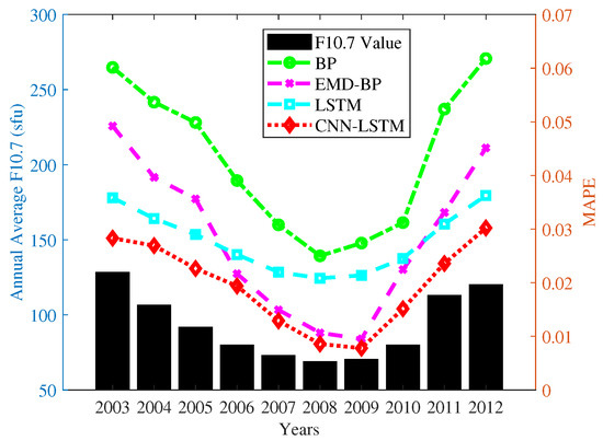 4.3. The Annual Accuracy Analysis of F10.7 Prediction