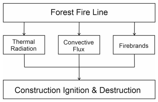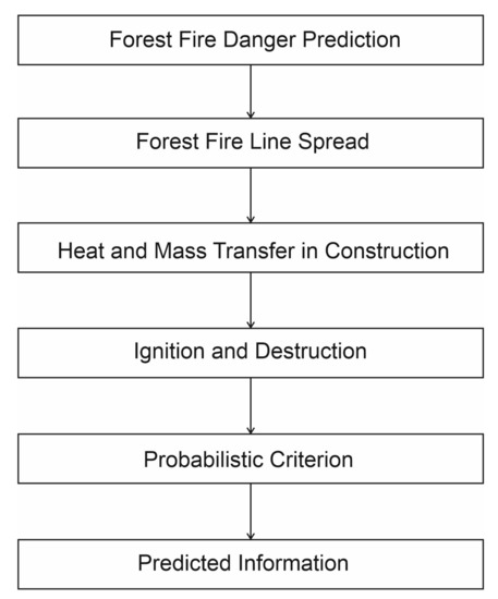Figure 1 shows a diagram of a deterministic–probabilistic prediction of the forest fire impact on residential and industrial facilities. Figure 2 shows the physical mechanism of heat transfer from the forest fire front to the structural materials of the building.
