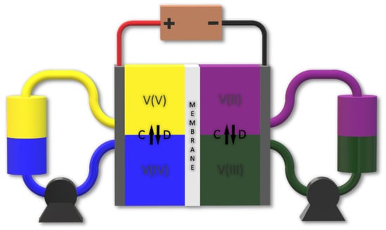 In principle, the electrolytes can be recycled through remixing and re-separation, giving the electrolyte an unlimited cycle life [,]. Other advantages include the possibility to use fast and slow discharging rates with a high depth of discharge (DoD), system cooling by heat extraction of the electrolyte, a long calendar life, no damage by overcharging and the good electrochemical kinetics of vanadium [].