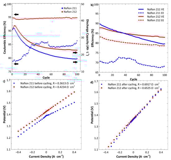 The polarization curves (Figure 2c) show that the total resistance of the VRFB using Nafion 211 is lower than when Nafion 212 is used. As all experimental conditions are the same except for the membrane, therefore, the difference in total resistance is mainly attributed to the membrane resistance. This is precisely why the VE of the VRFB is initially Higher when Nafion 211 is used (Figure 2b). However, after around 35 cycles, the VE decreases more rapidly compared to Nafion 212 as the increase in membrane resistance is more remarkable for Nafion 211. Polarization curves after 100 cycles (Figure 2d) confirm the latter.