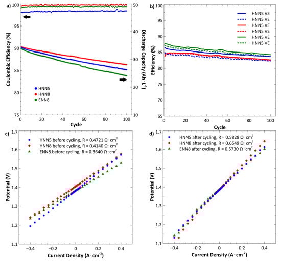 Charge/Discharge performance of the VRFB cell for HNN5, HNN8 and ENN8 membranes over 100 cycles showing (a) Coulombic Efficiency and Discharge Capacity, (b) Voltaic and Energy Efficiency, (c) Polarization curves prior to cycling, (d) Polarization curves after cycling. Experimental conditions: 1.6 M V(III) negative electrolyte, 1.6 M V(IV) positive electrolyte, both in 2 M H2SO4 supporting electrolyte, constant current charging at 200 mA cm−2, 200 rpm (86 mL min−1) flow rate and room temperature.