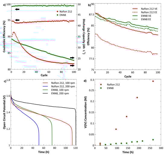The open-circuit voltage (OCV) over time was measured and is shown in Figure 4c. The VRFB using Nafion 212 demonstrates a self-discharge time of 110 h compared to 75 h using ENN8 at a flow rate of 100 rpm. Interestingly, running the OCV test at an elevated flow (200 rpm), the self-discharge time decreased to below 60 h for Nafion 212, while it increased to over 110 h for ENN8.