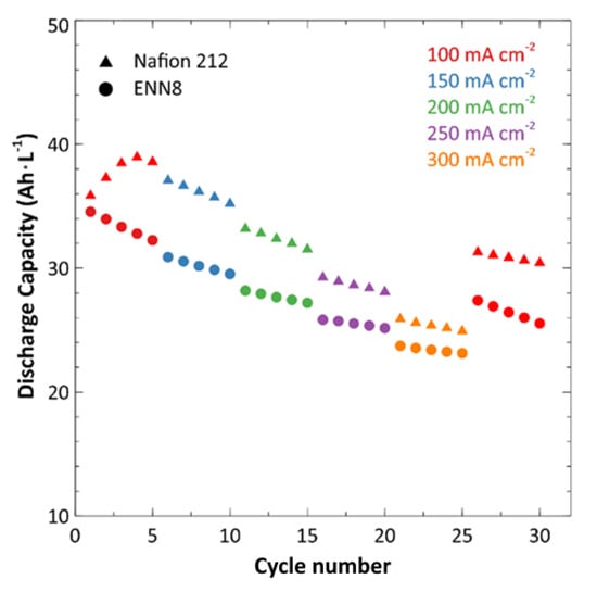 Rate performance analysis of the VRFB using Nafion 212 and ENN8 was conducted at different current densities (Figure 5). The analysis shows the discharge capacity stability of the VRFB by suddenly changing the current. It should be mentioned that the theoretical capacity of the VRFB considering the above-mentioned experimental conditions is ~43 Ah L−1. The VRFB using both membranes shows similar stability. The discharge capacity has a little falling rate at each current density. Larger capacities were achieved using Nafion 212 than ENN8 for all current densities as the VRFB was operated only for five cycles. A similar trend is seen in Figure 4a, where in the first 15 cycles, higher discharge capacities were achieved using Nafion 212. By increasing the current density, the reduction in discharge capacity for the VRFB using Nafion 212 is more remarkable, mainly due to the higher total cell resistance.