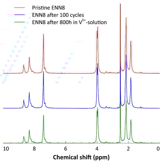 Finally, the (electro)chemical degradation of the ENN8 was studied by 1H NMR analysis. Figure 6 compares the spectra of three membrane samples: pristine ENN8, the ENN8 after 100 cycles and ENN8 after immersion in 1.6 M highly oxidizing V(V) solution for 800 h. Considering the higher shifts in the aromatic region, no substantial difference can be seen between the membranes, indicating that ENN8 possesses good chemical stability for VRFB applications.
