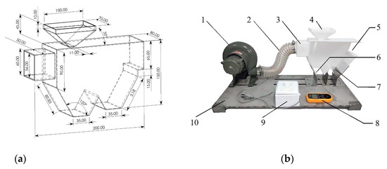 Rice cleaning device. (a) Simulation model; (b) experiment device. 1. Blower; 2. Ventilation pipe; 3. Air inlet; 4. Material inlet; 5. Outlet 3; 6. Outlet 1; 7. Outlet 2; 8. Hand-held anemometer; 9 Airflow speed adjustment switch; 10. Base plate.