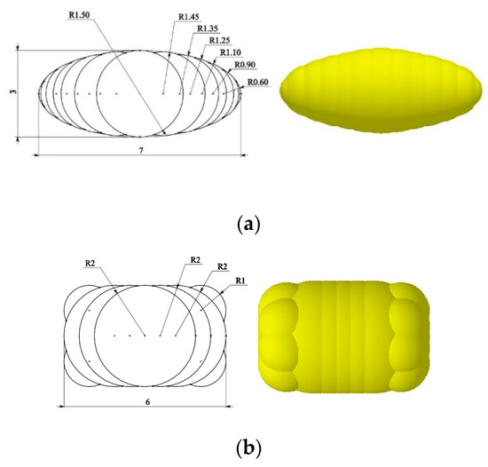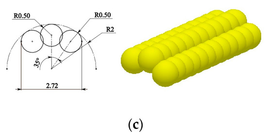 Based on the measured data in Figure 2, the three types of particles are modeled in EDEM using the “overlapping multi-sphere clump method (OMCM)” [14,15]. Figure 3 is a schematic diagram of the size of the particle cross-section and the particle model after filling. The rice particle is filled with 13 spheres of different diameters, and the rice stalk is filled with 4 spheres with a radius of 2 mm and 16 spheres with a radius of 1 mm. The broken rice stalk is filled with 36 spheres with a radius of 0.5 mm. Although the rice stalk can be regarded as a hollow cylinder and the broken rice stalk are curved surface flakes, the contact between the rice stalks, broken rice stalks, and other particles occur on the surface of the particles during the cleaning process. Therefore, the rice stalk and broken rice stalk formed by filling and combining multiple spherical particles meets the simulation requirements. In the EDEM particle attribute setting, the mass of real rice stalk and broken rice stalk are manually entered to ensure the authenticity of the simulation. The material properties of the cleaning device and the particles are shown in Table 1 [16,17].