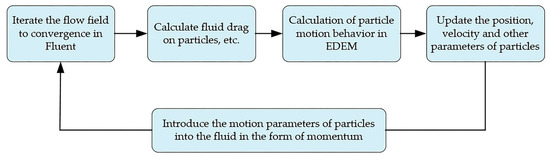 Figure 4 is a schematic diagram of the Fluent-EDEM coupling simulation process. First, Fluent calculates the flow field at a certain time point to convergence, and the flow field information is converted into the fluid drag force acting on the particles in EDEM through the drag force model. Second, EDEM calculates the external force (fluid drag force, gravity and collision force, etc.) on each particle, and updates the particle's position, velocity and other information accordingly. Finally, these particle properties are added to the CFD calculation in the form of momentum sinks, thereby affecting the flow field, and obtaining the flow field law and the law of particle system motion parameters.