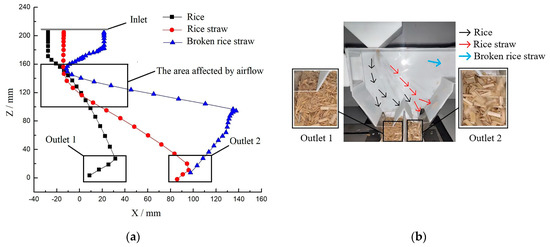 The ratio of the number of rice, rice straws, and broken rice straws in the simulation is set to 4:1:0.25; the total weight of rice in the experiment is 493.78 g (about 12,000), the total weight of rice straw is 20.31 g (about 3000), and the total weight of broken rice straws is 0.46 g (about 750). The airflow inlet velocity of the experimental device and the airflow inlet of the simulation model are both adjusted to 5 m/s, and the mixed particles entered the device through outlet 1. According to the change of the average position of the three particles in Figure 5, it can be seen that the particles have three different trajectories inside the device. The rice will move horizontally after being affected by the airflow and finally fall into outlet 1. The horizontal displacement of the rice stalks is larger than that of the rice, and it falls into outlet 2 after making an oblique throwing motion. The horizontal displacement of the broken rice stalks is larger than that of rice and rice stalks. After being thrown obliquely, the rice stalks contact the sidewall of outlet 2 and then fall into outlet 2. In the simulated particle trajectory and the transient graph of the experiment in Figure 5b, the velocity vector trajectories of rice stalks and broken rice stalks are similar to those in the experiment.
