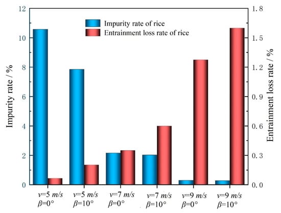 The statistical results at the outlet of the simulation and the number of particles collected by the trough at the outlet of the experimental device are substituted into formulas (9) and (10) respectively to obtain the cleaning results in Figure 6. In the figure, when the airflow inclination angle β is 0, the impurity rate (entrainment loss rate) of rice with airflow velocity of 5 m/s, 7 m/s, and 9 m/s are 10.575% (0.066%), 2.162% (0.351%), and 0.307% (1.275%), respectively. Under the same cleaning parameters, the impurity rate (entrainment loss rate) of rice was 11.528% (0.117%), 3.464% (0.669%), and 0.721% (1.541%) respectively. The comparison shows that the simulation and experimental results have the same changing trends, but the particle mass and volume in the simulation are the average values after measurement. In the experiment, there is dried-out rice and insect-eaten hollow rice whose quality is less than the average, and the volume of rice straw also had randomness. During the experiment, the dried-out rice and insect-eaten hollow rice with a mass less than the average entered outlet 2 with impurities, and the rice stalks with a mass greater than the average could not be separated after the airflow and entered outlet 1, which ultimately caused the experiment result to be larger than the simulation result.