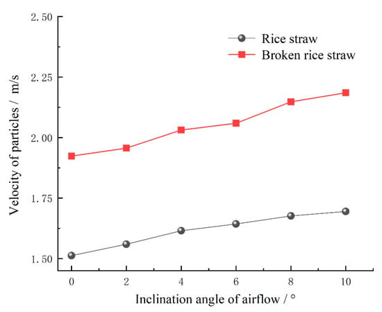 In aerodynamics, the flight coefficient of an object is defined as the inverse ratio of the force of the airflow to its gravity, and its magnitude reflects the displacement of the object in the flow field. Therefore, the greater the horizontal force of the three kinds of particles inside the cleaning device is subjected to the airflow, the greater the displacement produced. Combining the statistical results in Figure 6, it can be seen that when the airflow tilt angle is 0, increasing the airflow velocity, the impurity rate of rice is significantly reduced, and the entrainment loss rate has increased. When the airflow inlet is rotated counterclockwise, the area where the airflow acts inside the device will extend upwards. Combining the calculation results of the speed changes of the two impurities in Figure 7, it can be seen that the larger the airflow tilt angle, the greater the velocity of the particles in the flow. The increase in speed indicates that the displacement of the three particles has increased, and finally the impurity rate of rice has decreased, and the entrainment loss rate has increased.