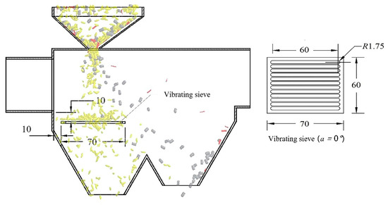 To analyze the influence of the cleaning method on the cleaning effect and to compare the difference in the effect of air separation and air-sieve cleaning, a horizontal sieve was added above outlet 1 in the device. The position of the sieve is shown in Figure 8, the length of the sieve surface is 70 mm, the width is 60 mm, and the thickness is 2 mm. In the simulation, the airflow velocity was set to 5 m/s with a poor cleaning effect, the vibration frequency was 10 Hz and the amplitude was 1 mm. It can be seen from the particle trajectory diagram in the device that the particles entering the cleaning device will accumulate temporarily on the sieve under the condition of having a vibrating sieve. Some of these particles enter outlet 2 (impurity outlet) along the direction of the screen surface, and the some enter outlet 1 (rice outlet) through the screen hole. Since the width of the sieve hole is smaller than the width of the rice straw, the rice straw on the sieve surface cannot pass through the sieve hole and can only enter outlet 2 along the sieve surface, and some of the rice straw still enters the outlet 1 along the sieve surface.