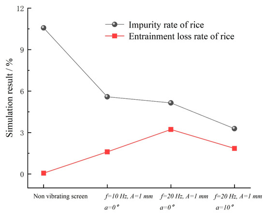 From the simulation results with different parameters in Figure 9, it can be seen that when the vibration frequency of the sieve surface is 10 Hz and the amplitude is 1 mm, the impurity rate of rice is 5.588% and the entrainment loss rate after statistics is 1.607%. By comparison, it is found that when the airflow velocity is the same as 5 m/s, the impurity rate decreases by 4.987%, and the entrainment loss rate increases by 1.541% after adding the vibrating sieve. When the frequency was changed to 20 Hz, the impurity rate of rice decreased by 0.446% and the entrainment loss rate increased by 1.618% compared with the simulation results with a frequency of 10 Hz. Compared with the simulation results when only airflow is used for cleaning, it is found that the impurity rate of rice during air-sieve cleaning (20 Hz) is reduced by 4.987%, and the entrainment loss rate is increased by 1.541%. When the airflow velocity and amplitude remain unchanged, although increasing the vibration frequency can reduce the impurity rate of rice, the increase in frequency will result in a significant increase in the entrainment loss rate of rice.