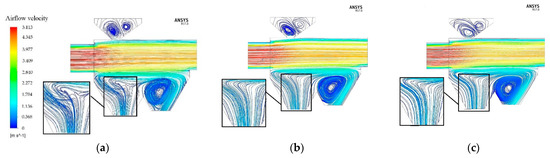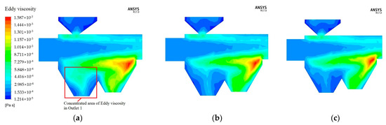 Eddy viscosity refers to the eddy diffusion phenomenon caused when the fluid flow is in the vortex flow. At this time, the fluid can be regarded as having a great viscosity, and it also has a viscous dimension, which can describe the fluid flow state instead of its true viscosity. Figure 11 shows the eddy viscosity cloud diagram of the device under three structures: no vibrating sieve, horizontal vibrating sieve, and inclined vibrating sieve, and it can be seen from the figure that the strong eddy viscosity mainly appears in the area near the outlet 2, and the eddy viscosity at the outlet 1 of the no-sieve device in Figure 11a is larger than the eddy viscosity in the same position in the sieve cleaning device in Figure 11b,c. Combining with the corresponding velocity streamline diagrams in Figure 12, it is found that obvious eddy currents appear at outlet 2 under the three structures, and the velocity near the right wall surface is larger. When there is no sieve inside the device, a vortex flow phenomenon occurs locally at outlet 1, while when there is a sieve, the streamline at outlet 1 passes through the sieve hole, and there is no vortex flow phenomenon. In summary, the strong eddy viscosity inside the cleaning device mainly appears in the area where the airflow velocity is large and the velocity flow line appears vortex or has the trend of a vortex, and changing the inclination angle of the vibrating sieve has little effect on the distribution of eddy viscosity.