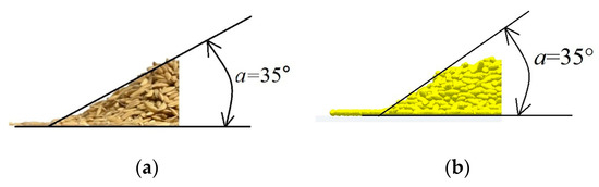 Selecting 80 g of dried rice particles for humidification, the mass of the humidified rice is 95.8 g, and the moisture content of the rice is 16.49% according to Equation (19). The rice straw was also humidified, and the moisture content of the rice straw was 23% after measurement. The surface energy of the JKR contact model in EDEM was calibrated by corresponding the moisture content of the material with the surface energy after obtaining the moisture content by the weighing method. The experimental device is shown in Figure 13a, which consists of a funnel, a support, and a bottom plate; the funnel is fixed on the support with a distance of 70 mm between the narrow opening and the bottom plate. The angle of repose calibration experiment is performed by using the difference in flow characteristics of wet and dry particles, and the angle of repose of the rice pile is measured after the rice is poured into the funnel and scattered onto the bottom plate. The simulation result in Figure 11a shows that the angle of repose of dry rice (surface energy = 0) is 29.5°, which is within a reasonable range of error from the experimental result (29°) in Figure 13b.