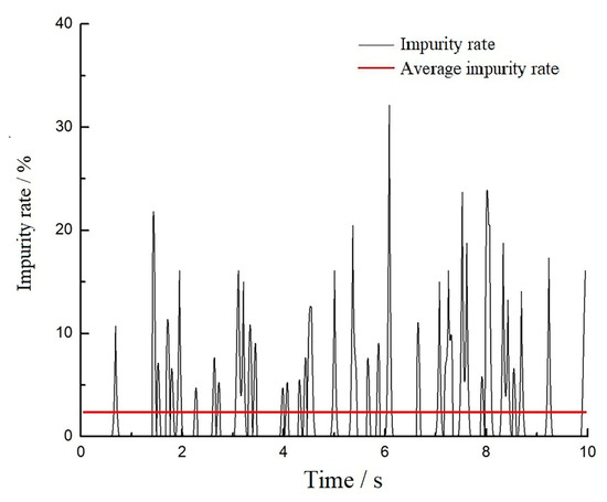 After setting the surface energy between the materials, the rice cleaning with an air velocity of 9 m/s is simulated (Since the JKR model only considers the bonding between wet particles and does not take into account the change in particle mass after humidification, the masses of the three particles were manually corrected according to the measured results before the simulation). Figure 15 shows the statistical results of the rice impurity rate and the average impurity rate under the condition of moisture content. From the figure, it can be seen that the cleaning effect of rice with moisture content of 16.49% and rice straw with moisture content of 23.00% is different from the simulation results under the same airflow velocity material drying condition; the average impurity rate of rice with moisture content is 2.356%, which is 2.049% higher compared with the drying condition; the calculated entrainment loss rate of rice is 0.756%, a decrease of 0.519% compared to the results under the drying conditions. Combined with the simulation results, it can be seen that since the mass of rice containing water is larger than that under dry conditions, the flight coefficient (P/G) of the three particles becomes smaller and their displacement in the flow field becomes smaller under the condition of being subjected to a constant horizontal force P of the airflow, resulting in some of the rice straws entering the outlet 1. The presence of the liquid bridge force between the particles can bond some of the rice to the rice straw, but the increase in the mass of the rice containing water will result in it being less susceptible to entrainment of impurities into outlet 2. In summary, when wet rice was cleaned, the average impurity rate of the rice was significantly increased, and the entrainment loss rate was decreased.