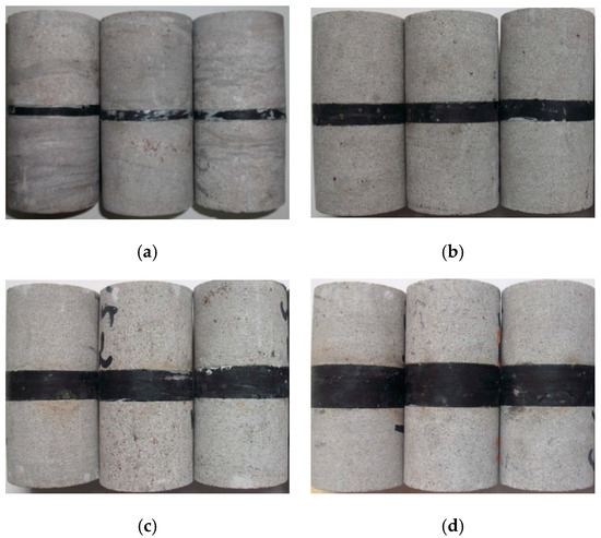 The medium-grained sandstone and coal samples were collected from the Bulianta Coal Mine and the Burtai Coal Mine in Ordos, Inner Mongolia. The samples were processed into standard samples with a diameter of 50 mm and a height of 100 mm according to the requirements of the specification [20]. The uniaxial compression test samples were divided into six groups, of which Group A (A1~A3) consisted of complete medium-grained sandstone samples, Group B (B1~B3), Group C (C1~C3), Group D (D1~D3), and Group E (E1~E3) were interbedded medium-grained sandstone samples with interlayer thickness accounting for 5%, 10%, 15%, and 20% of the total height of the sample, respectively. Group F (F1~F3) were coal samples. The triaxial compression samples were divided into four groups: Group SZA (SZA-1~SZA-5), Group SZB (SZB-1~SZB-5), Group SZC (SZC-1~SZC-5), and Group SZD (SZD-1~SZD-5) with five samples in each group. They were medium-grained sandstone samples with interlayer thickness accounting for 5%, 10%, 15%, and 20% of the total height of the sample, respectively. The sample scheme design is shown in Figure 1, and the physical picture is shown in Figure 2.