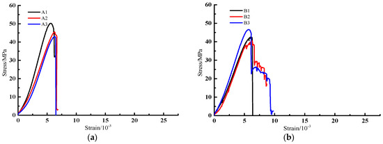 Table 1 shows the uniaxial compression test results of the interbedded sandstone with different interlayer thickness, where σc is the uniaxial compressive strength, εc is the peak strain, E is the elastic modulus, and μ is Poisson’s ratio. Figure 4, Figure 5 and Figure 6 show the relationship between peak stress and interlayer thickness, the relationship between elastic modulus and interlayer thickness, and the relationship between peak strain and interlayer thickness. With Figure 4, Figure 5 and Figure 6 and Table 1 combined, it can be seen that the compressive strength is 45.55–50.76 MPa with an average value of 48.85 MPa for the complete medium-grained sandstone; 40.07–42.92 MPa with an average of 41.97 MPa for the interbedded medium-grained sandstone with interlayer thickness of 5 mm that accounts for 5% of the total height of the sample; 40.89–42.14 MPa with an average of 41.41 MPa for the interbedded medium-grained sandstone with interlayer thickness of 10 mm that accounts for 10% of the total height of the sample; 38.79–42.13 MPa with an average of 40.70 MPa for the interbedded medium-grained sandstone with interlayer thickness of 15 mm that accounts for 15% of the total height of the sample; and 41.87–43.62 MPa with an average of 42.52 MPa for the interbedded medium-grained sandstone with interlayer thickness of 20 mm that accounts for 20% of the total height of the sample. Moreover, the peak strain is (5.63–6.26) × 10−3 with an average of 6.00 × 10−3 for the complete medium-grained sandstone; (5.73–6.26) × 10−3 with an average of 6.01 × 10−3 for the interbedded medium-grained sandstone with interlayer thickness of 5 mm that accounts for 5% of the total height of the sample; (7.67–8.12) × 10−3 with an average of 7.95 × 10−3 for the interbedded medium-grained sandstone with interlayer thickness of 10 mm that accounts for 10% of the total height of the sample; (8.41–9.03) × 10−3 with an average of 8.73 × 10−3 for the interbedded medium-grained sandstone with interlayer thickness of 15 mm that accounts for 15% of the total height of the sample; and (8.26–10.4) × 10−3 with an average of 9.02 × 10−3 for the interbedded medium-grained sandstone with interlayer thickness of 20 mm that accounts for 20% of the total height of the sample. In addition, the elastic modulus is 8.9–11.68 GPa with an average value of 10.02 GPa for the complete medium-grained sandstone; 8.68–9.2 GPa with an average value of 8.89 GPa for the interbedded medium-grained sandstone with interlayer thickness of 5 mm that accounts for 5% of the total height of the sample; 6.51–6.77 GPa with an average value of 6.61 GPa for the interbedded medium-grained sandstone with interlayer thickness of 10 mm that accounts for 10% of the total height of the sample; 5.68–5.93 GPa with an average value of 5.79 GPa for the interbedded medium-grained sandstone with interlayer thickness of 15 mm that accounts for 15% of the total height of the sample; and 5.35–5.83 GPa with an average value of 5.53 GPa for the interbedded medium-grained sandstone with interlayer thickness of 20 mm that accounts for 20% of the total height of the sample. There is no obvious law for Poisson’s ratio of interbedded medium-grained sandstone with different interlayer thickness, and the interlayer thickness has no significant effect on Poisson’s ratio for jointed sandstone.