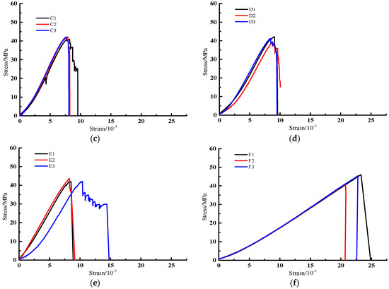 Stress–strain curves of complete sandstone, four kinds of interbedded sandstone with different interlayer thickness, and coal: (a) complete medium-grained sandstone; (b) medium-grained sandstone with interlayer thickness of 5 mm; (c) medium-grained sandstone with interlayer thickness of 10 mm; (d) medium-grained sandstone with interlayer thickness of 15 mm; (e) medium-grained sandstone with interlayer thickness of 25 mm; (f) coal.