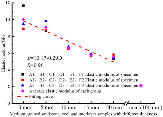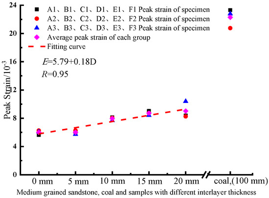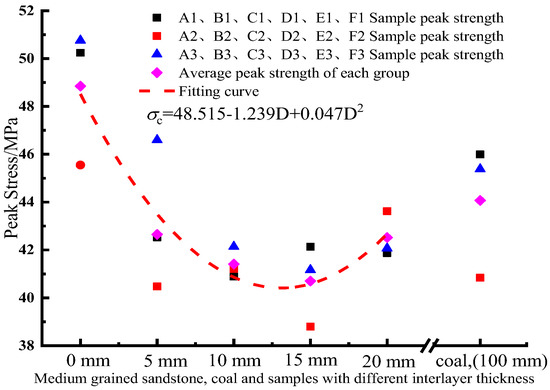 Figure 3 shows the stress–strain curves of the complete medium-grained sandstone, coal, and four interbedded medium-grained sandstone samples with different interlayer thickness. It is indicated in this figure that the stress–strain curves of the complete medium-grained sandstone and four interbedded medium-grained sandstone samples with different interlayer thickness can be basically divided into four stages, i.e., initial compaction stage, linear elastic stage, plastic deformation failure stage, and post-peak failure stage. However, the stress–strain curve of the coal sample only exists in the initial compaction stage, linear elastic stage, and plastic deformation failure stage. This is mainly due to the brittleness of the coal sample. Before the coal sample is damaged, a large amount of energy is accumulated. It is released instantaneously during the damage. The damage degree of the sample is high, and the sound of the coal sample collapsing can be heard during the test, indicating that the impact to the coal sample is relatively strong. Furthermore, Figure 3 also indicates that the upwelling phenomenon of the four interbedded medium-grained sandstone samples with different interlayer thickness is relatively complete in the initial compaction period, and the strength of the interbedded medium-grained sandstone is weakened. With the increase of the interlayer thickness, the slope of the linear elastic phase decreases, and the curve near the peak stress becomes steep. This means that the impact to the medium-grained sandstone increases with the increase of the interlayer thickness. In addition, there is a step-down phenomenon in the post-peak failure stage. This is mainly due to the gradual increase of the interlayer thickness and thus the increasing influence of the mechanical properties of coal on the intercalated medium-grained sandstone.