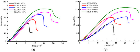 Figure 7 shows the stress–strain curves of the interbedded medium-grained sandstone with different interlayer thickness from the triaxial compression test. It can be seen from Figure 7 that the triaxial compressive stress–strain curves of the interbedded sandstone with different interlayer thickness all have four stages: compaction stage, linear elastic stage, yield stage, and failure stage. The stress–strain curves are concave in the initial compaction stage, and almost straight lines in the linear elastic stage. When the interlayer thickness is the same, with the increase of confining pressure, the pre-peak elastic stage and the yield stage are obviously prolonged, the peak strain increases, obviously, the peak strength point moves backward, the residual strength after failure also increases, obviously, and the peak strength of the sample increases. When the confining pressure is the same, with the increase of interlayer thickness, the initial compaction stage is prolonged, the pre-peak elastic stage and the yield stage are significantly prolonged, and the peak strain point obviously moves backward. However, in the linear elastic stage, with the increase of interlayer thickness, the peak strength decreases and the slope of the stress–strain curve decreases. This indicates that the interlayer thickness has a direct effect on the elastic modulus of the interbedded medium-grained sandstone.