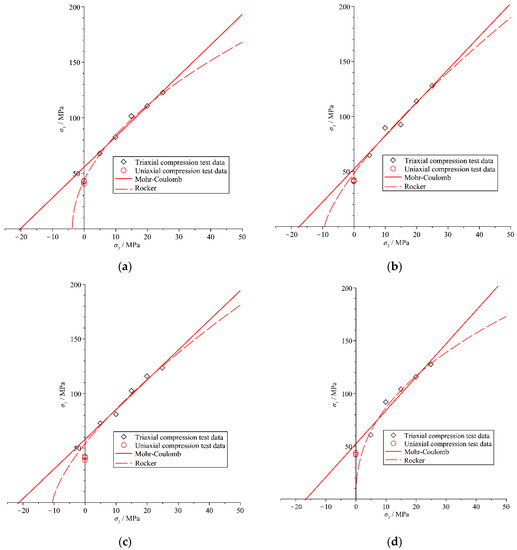 The Mohr–Coulomb strength criterion is widely used in the design of rock mass engineering and the analysis of geological structure [22], which is one of the classical strength theories in rock mechanics.
