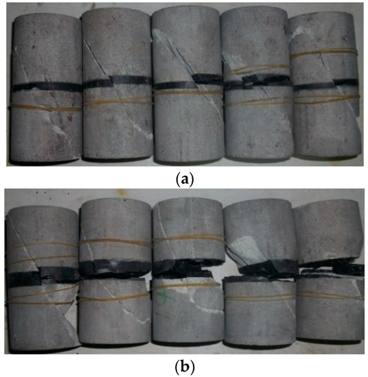 Figure 9 shows the failure mode of the sample after the triaxial compression test of the interbedded medium-grained sandstone samples with different interlayer thickness. The failure characteristics of the samples with different interlayer thickness and different confining pressures. When the confining pressure is in the range 5.0–25.0 MPa, shear expansion failure appears in the samples, the fracture surface is complex, and the shear slip failure process is also accompanied by tensile cracks, with the characteristics of local tensile failure. The medium-grained sandstone with interlayer is mainly fractured by tension, which can form through cracks.