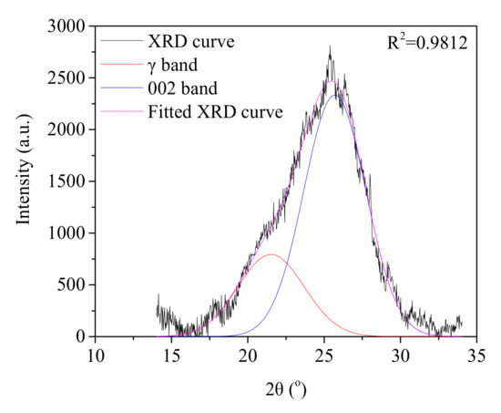 The X-ray diffraction (XRD) patterns of the resulting chars were obtained by using a PANalytical X’Pert3 Powder diffractometer with a Cu Kα radiation source, which could provide the information on graphitization degree. Each spectrum was recorded in a 2θ angle range of 10–80° with a scanning speed of 4°/min. In order to quantify the graphitization degree of char sample, the curve-fitted method was applied for (002) peak of XRD patterns. Take the SA char as an example; a typical curve-fitted result of the resulting char is shown in Figure 1. The formulas and physical meanings of the microcrystalline structure parameters have been described in detail in previous work [23]. In general, a large stacking layer number N of char samples means a higher graphitization degree.