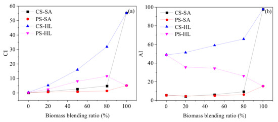 Different AAEMs exhibited different behaviors during pyrolysis, and thus two representative catalytic indices were used to quantitatively describe the role of inorganic materials in the gasification process. As depicted in Figure 2, the value of CI increased with the increase in blend ratio. Additionally, the promotion effect of CS on the CI was more significant than that of PS. The variation trend of CI was consistent with the results of K mentioned above. However, it could be obviously observed that the changes of AI and CI were significantly different, indicating that the selection of catalytic indices needed to be treated with caution.
