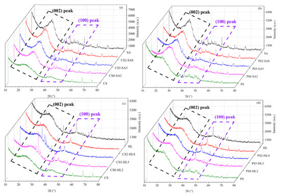 The original XRD patterns of different char samples are presented in Figure 3. The (002) and (100) diffraction peaks at 2θ angle range of 14~34° and 38~50° could be obviously observed in the XRD spectra. In general, the (002) peak could reflect the stacking between the aromatic rings, while the (100) peak could represent the size of aromatic crystallite within a single plane. Results showed that the background intensity of the (002) peak in the XRD spectrum of SA char decreased with the addition of CS and PS. The same results were shown in the XRD spectrum of HL char, indicating that the structure of the coal char tended to disordering owing to the addition of the biomass during co-pyrolysis. Moreover, at the same mass ratio, CS addition showed a more significant decrease effect on background intensity than PS addition.