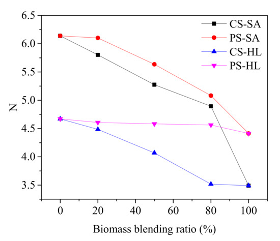 It could be observed that as the CS blend ratios increased from 20 to 80%, N values of CS-SA decreased from 5.8 to 4.89, while the N values of CS-HL decreased from 4.48 to 3.51. Likewise, N values of PS-SA were gradually reduced from 6.1 to 5.08 as the PS blend ratios increased from 20 to 80%, while the N values of PS-HL decreased slightly from 4.61 to 4.56. The results were consistent with the qualitative analysis, indicating that the addition of CS and PS inhibited the graphitization process of coal char during co-pyrolysis. Moreover, the inhibit effect of CS and PS on the graphitization process was promoted with increasing blend ratio, which could be attributed to the fact that with the increase in biomass ratio, the more AAEM contents in coal char were transferred from biomass, and the greater inhibition effect on the graphitization degree of coal char was discovered. Meanwhile, the inhibition effect of CS was higher than that of PS at the same blend ratio. The reason was that CS contained more AAEMs, the content of K and Mg in CS especially was significantly higher than that of PS. It has been well confirmed that the presence of AAEMs could inhibit the microcrystalline structure of char in the pyrolysis process, hindering the development of graphitization degree, and thus promote the formation of amorphous carbon structure [28,29]. On the other hand, compared with CS, PS contained more cellulose and less lignin and hemicellulose from the perspective of biomass compositions [28]. The order of carbon structure could be promoted by the cellulose, while lignin and hemicellulose could promote the three-dimensional development of char structure [19].