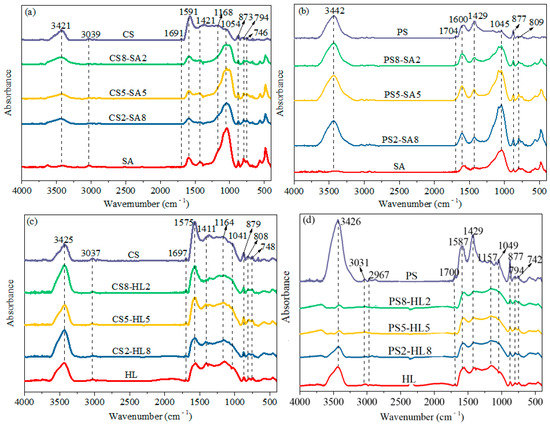 FTIR spectra of char samples with different biomass mass ratios: (a) SA char with different CS mass ratios, (b) SA char with different PS mass ratios, (c) HL char with different CS mass ratios, (d) HL char with different PS mass ratios.