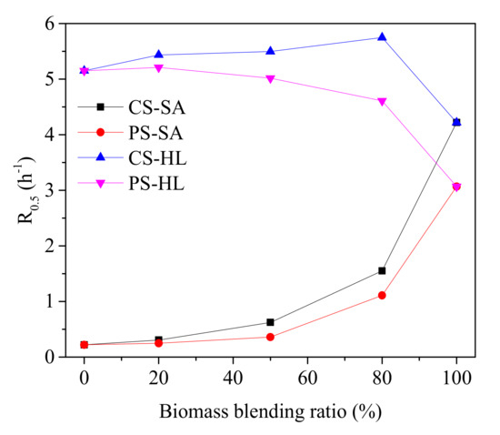 The effect of biomass type and blend ratio on the gasification reactivity of coal char samples was studied. As shown in Figure 6, the gasification reaction time required to achieve the same carbon conversion varied with the type and blend ratio of biomass. Moreover, the R0.5 values of char samples are shown in Figure 7. It could be observed that R0.5 values of SA char samples separated from the co-pyrolysis samples increased with the increasing blend ratio of biomass, indicating that CS and PS had a significant improvement effect on the gasification reactivity of SA char samples, and the improvement degree increased with the increase in additive proportion. In addition, CS had more significant effect on the reactivity of SA char samples than PS. As mentioned above, the changes of CI and AI could be responsible for the phenomenon, indicating that the gasification reactivity could be significantly improved by the AAEMs. Additionally, the small N value of SA char separated from the CS-SA mixture also contributed to improving the reactivity. However, the reactivity of HL char increased slightly with the addition of CS. Even the reactivity of HL char decreased with the addition of PS. Meanwhile, the reactivity of HL char was gradually diminished with increasing PS blend ratio.