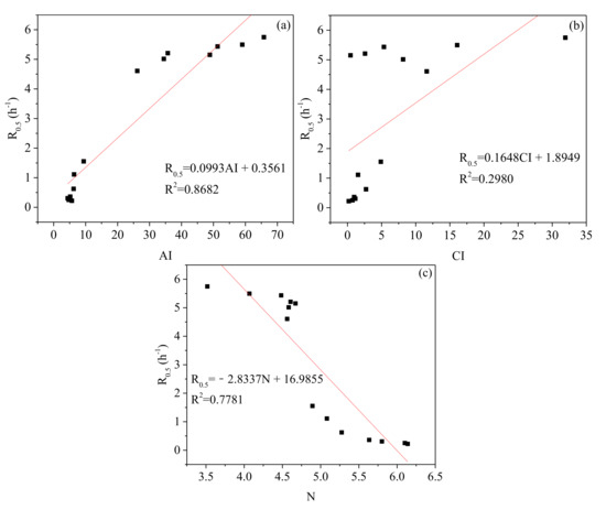 Relationships between individual structural properties and gasification reactivity index: (a) AI and R0.5, (b) CI and R0.5, (c) N and R0.5.