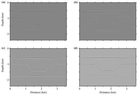 In the ECLSRTM scheme, we used Equations (8)–(12) to update the stacked image (Equation (14a–d)). In practice, the SP and SS images have a low resolution for explosive sources, and for this reason, we chose to update PP and PS images in the migration and de-migration processes. In the process of updating the images, we used the initial reflecitivity calculated by RTM as the input to compute the initial simulated data in the first iteration. Thus, a de-migration operator must be involved accordingly in ECLSRTM. Inspired by the framework of acoustic reverse time de-migration (RTDM) operator derivation (Zhang et al. [17]; Liu et al. [18]), we derived the elastic RTDM operator to generate the multicomponent seismic data.