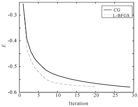 To verify the effectiveness of the L-BFGS method, we adopted the CG and L-BFGS methods for comparison. Figure 4 shows the convergence rate of the CG and L-BFGS methods, respectively. The L-BFGS method exited at the 20-th iteration to reach the criterion value of 0.001, whereas the CG method exited at the 29-th iteration thus demonstrating a lower efficiency.