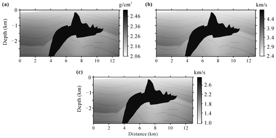 The real SEG/SALT velocity model: (a) Density; (b) P-wave velocity; (c) S-wave velocity.