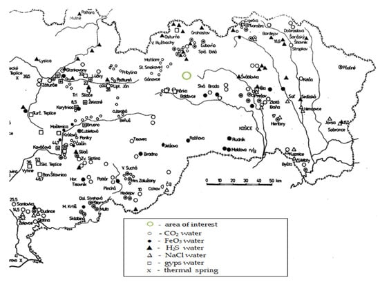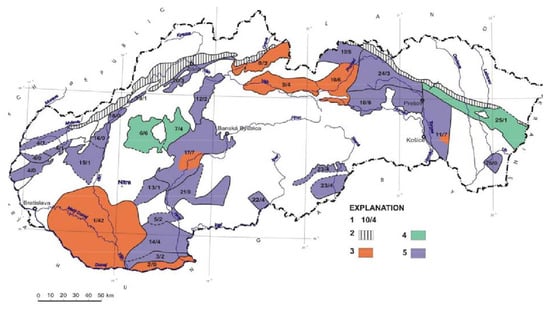 Those usable quantities also include usable amounts of thermal water as an integral part of groundwater and, for the sake of completeness, part of the mineral waters, in particular the usable quantities of mineral waters approved by the Hydrogeological Commission []. Figure 1 shows the prospective areas of geothermal waters in the Territory of the Slovak Republic.