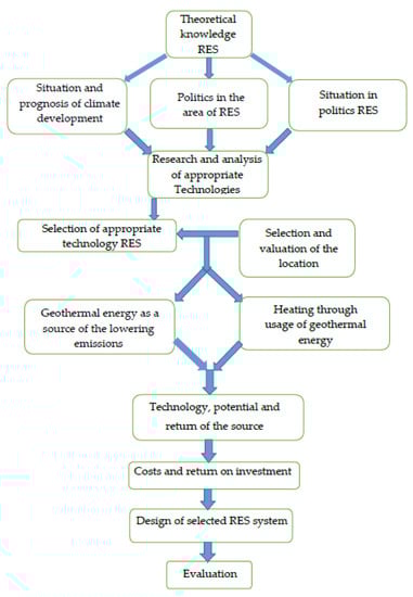 A methodological procedure was used to evaluate the use of the suggested possibilities regarding suitable RES technology with the best potential and lowest subsequent investment, with a recalculation, determination, and proposal as to whether the given system (investment) is suitable. The procedure for calculating the investment technology chosen, using geothermal energy, is as follows: