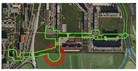 The processing of the geothermal contribution was based on data from the technical study of the geothermal well GTK-1, which is publicly available []. A specific site (GTK-1, Figure 5) has been designated in which to carry out the geothermal well under investigation. Residential houses (in a housing estate with a population of 5500) were selected that met the requirements for the use of geothermal energy from the borehole. To determine the yield of a geothermal source for heating the estimated capacity needed for the source was compared with the heating volume of 3 boiler rooms in previous years (average of years 2015–2017).