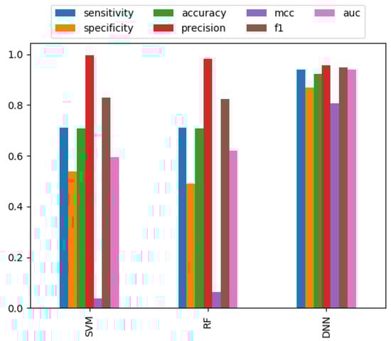 To find the best classifier for our dataset, we compared the performance of SVM, RF, and DNN classifiers. Different parameter-based performances were calculated for these classifiers and only the best result was reported here. In the majority of cases, we observed that the DNN classifier achieved the best performance (Table 1 and Table 2). As shown in Figure 2 and Figure 3, the performance of the DNN classifier is far superior to SVM and RF. Together, the results suggested that DNN performed better than other conventional MLT.
