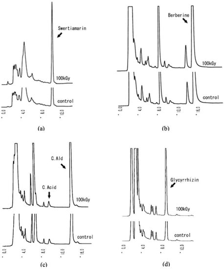 - Kimura, S.; Taimatsu, M.; Kodani, N.; Ohnishi, T.; Okamoto, S. Radiation sterilization of the crude drug “glycyrrhiza”. Biocontrol. Sci. 1997, 2, 87–92. [Google Scholar] [CrossRef][Green Version]